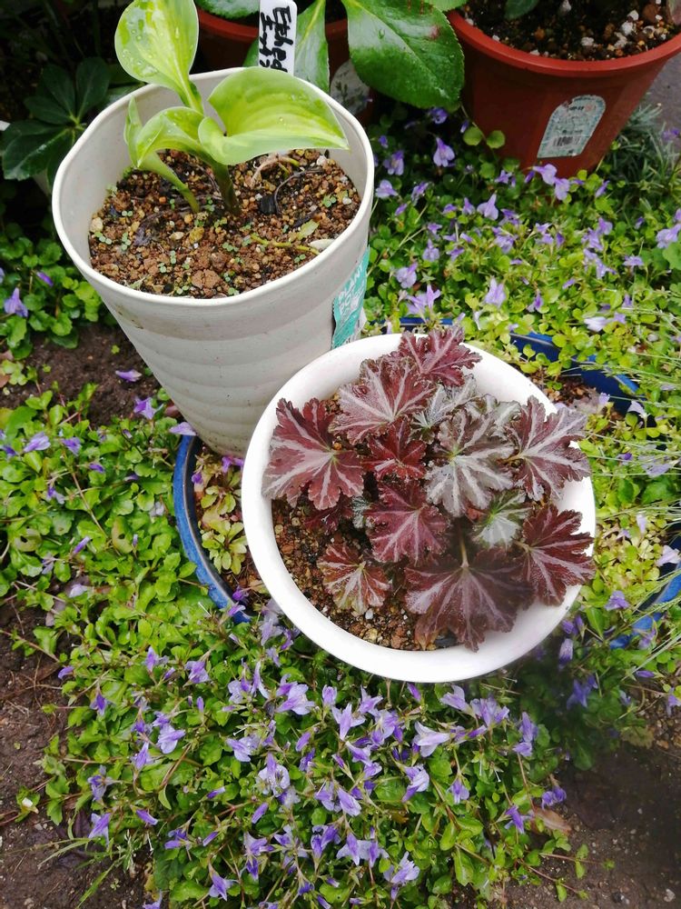 ムラサキサギゴケとホスタ エッヂドグラス、ムラサキジンジソウ?間違ってたら教えて下さい!