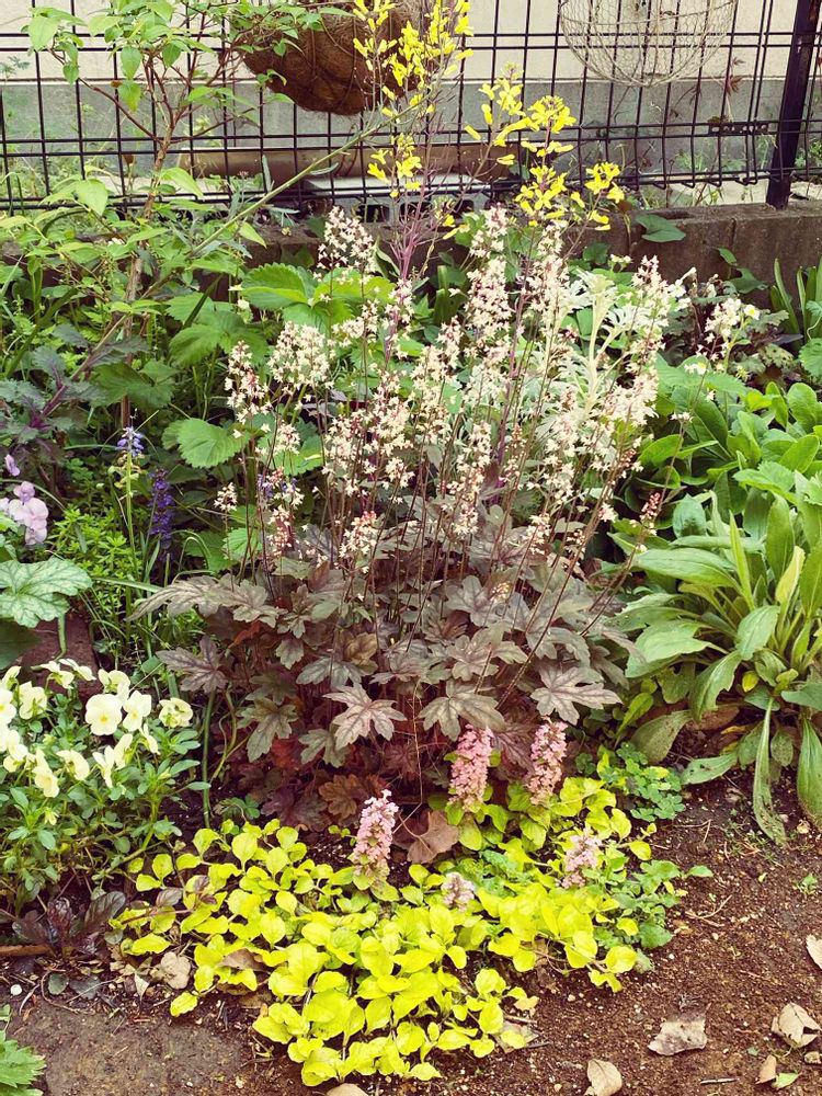 ヒユーケラとアジュガ。今日も穏やかな庭です。