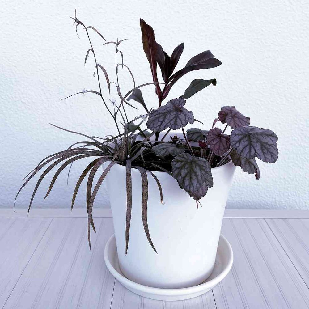 寄せ植えは、だいたい鉢からチョンチョン切って挿し木して作るので、滅多に新しい植物は加わりません😅冬に渋カラーのリーフを挿し木して作った寄せ植えですが、これもだいぶ茂ってきました。