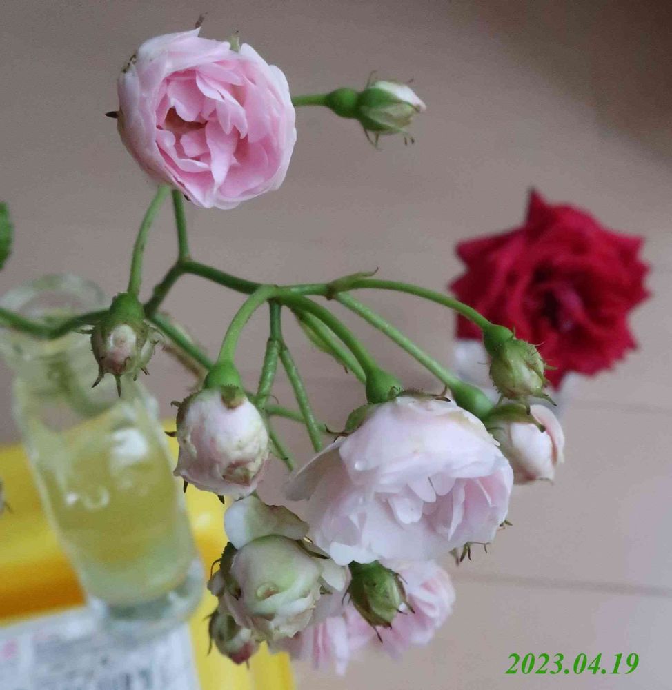 奥は接ぎ挿しの無名の赤いミニバラ、5.5cm の大輪になり重そうなので、切り花にしました ^^