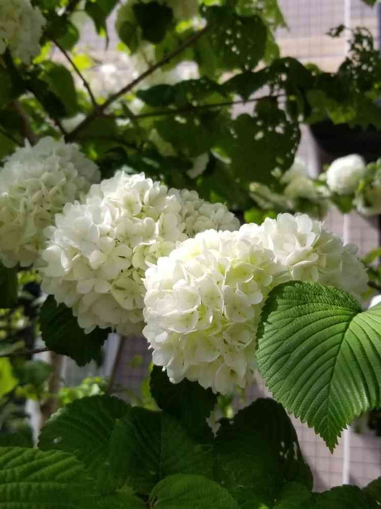 ウチのご近所さんの庭のオオデマリもライムグリーンから真っ白に変身しました。