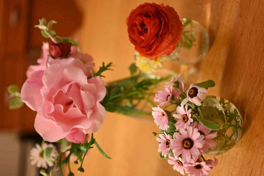 お庭に咲いた花たちを小さな花瓶に入れて飾りました。