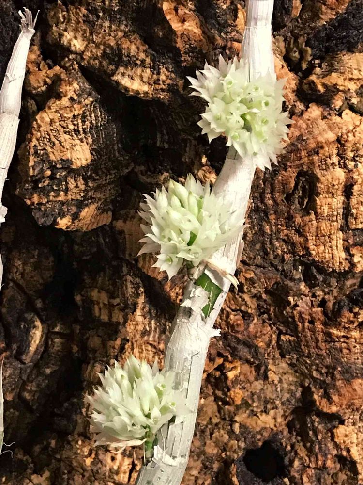 翡翠色の花、白いバルブや紫の葉裏、見どころの多い蘭です。