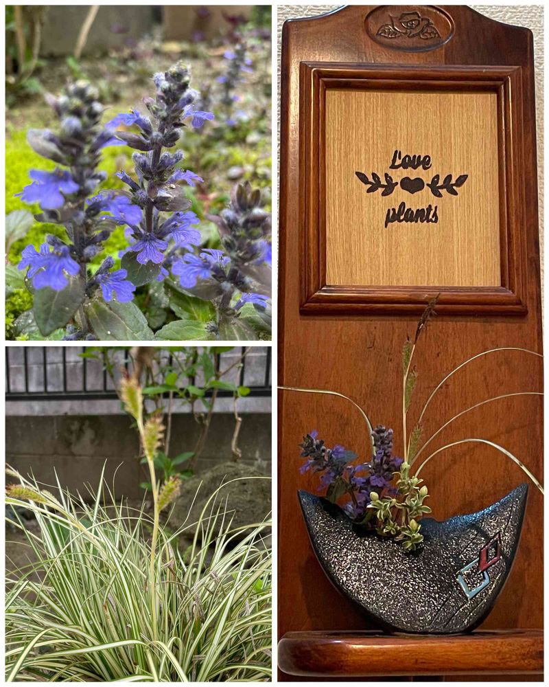 アジュガにカレックスの細い葉が動きがあって良い感じの生け方💕