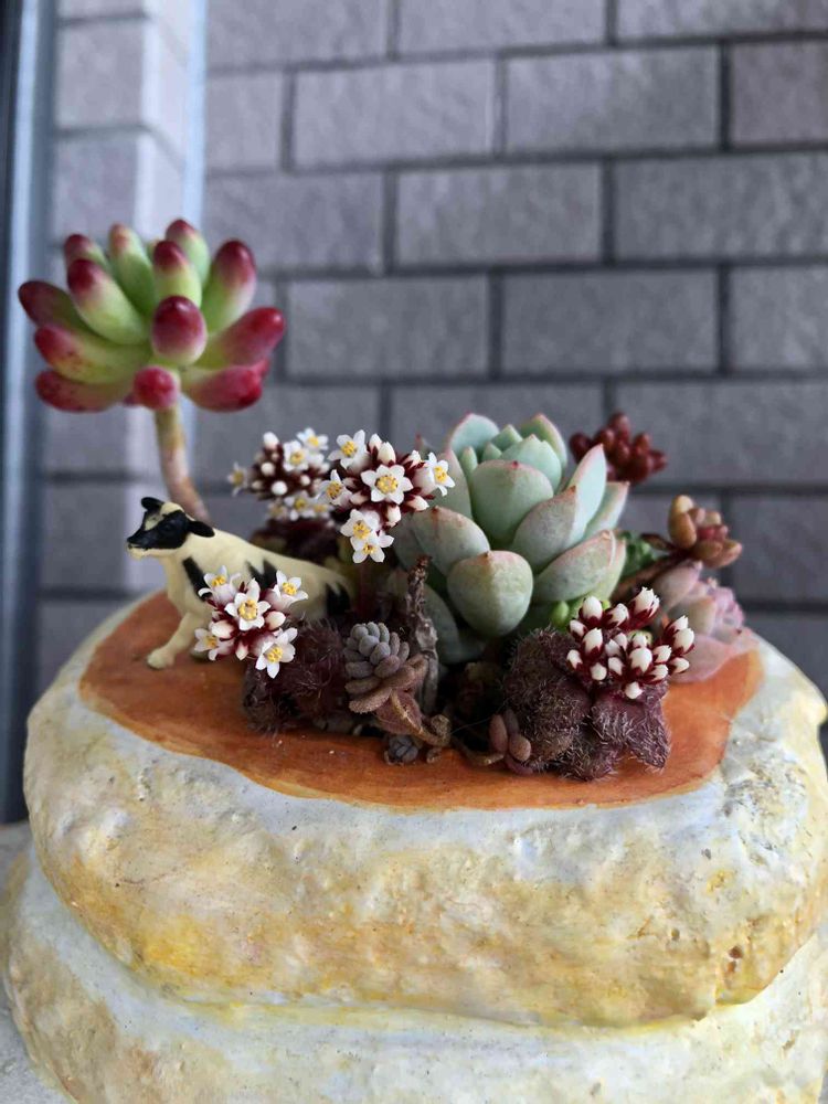 乙女心ちゃんの下のウシ🐄くんが、またいい雰囲気~🥰💖💕 多肉ちゃんたちのほっこりムードが良いわぁ~🤣🤣🤣