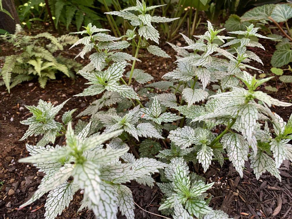 シルバー系で独特な雰囲気のラミウム。周りの植物との調和を考えて後方にニシキシダのメタリカを植えてみました。素人ですが試行錯誤しながら日陰の庭づくりを楽しんでます。