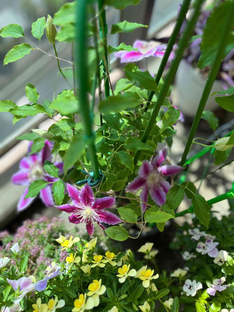 2年目のクレマチス(ドクターラッペル)咲いてくれています❁⃘*.゚茎は木化して枯れているように見えるのに水は吸い上げられるんですね。春になってからどんどんツルが伸びてきて誘引に苦労しています😅