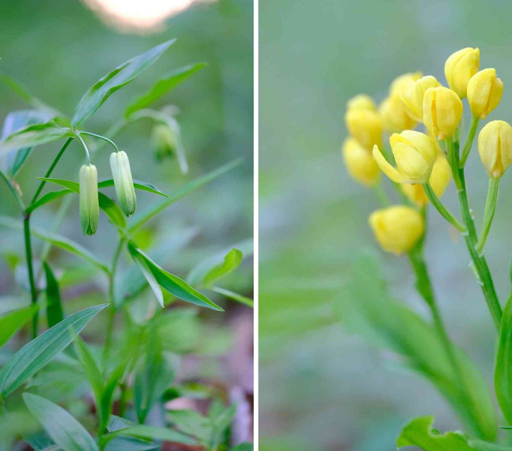 左は花の付け根に突起がないのでアマドコロと似ていますが葉や花の形からホウチャクソウと判断しました。