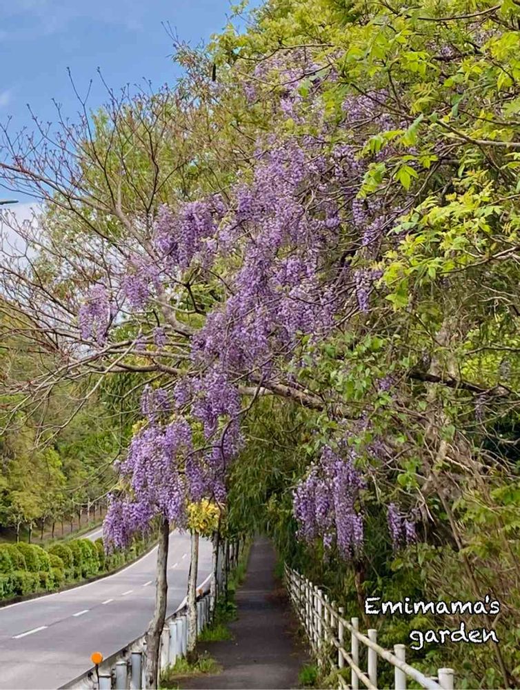 空に向かって上がって行く歩道が藤の花のアーチで覆われてるの~♡