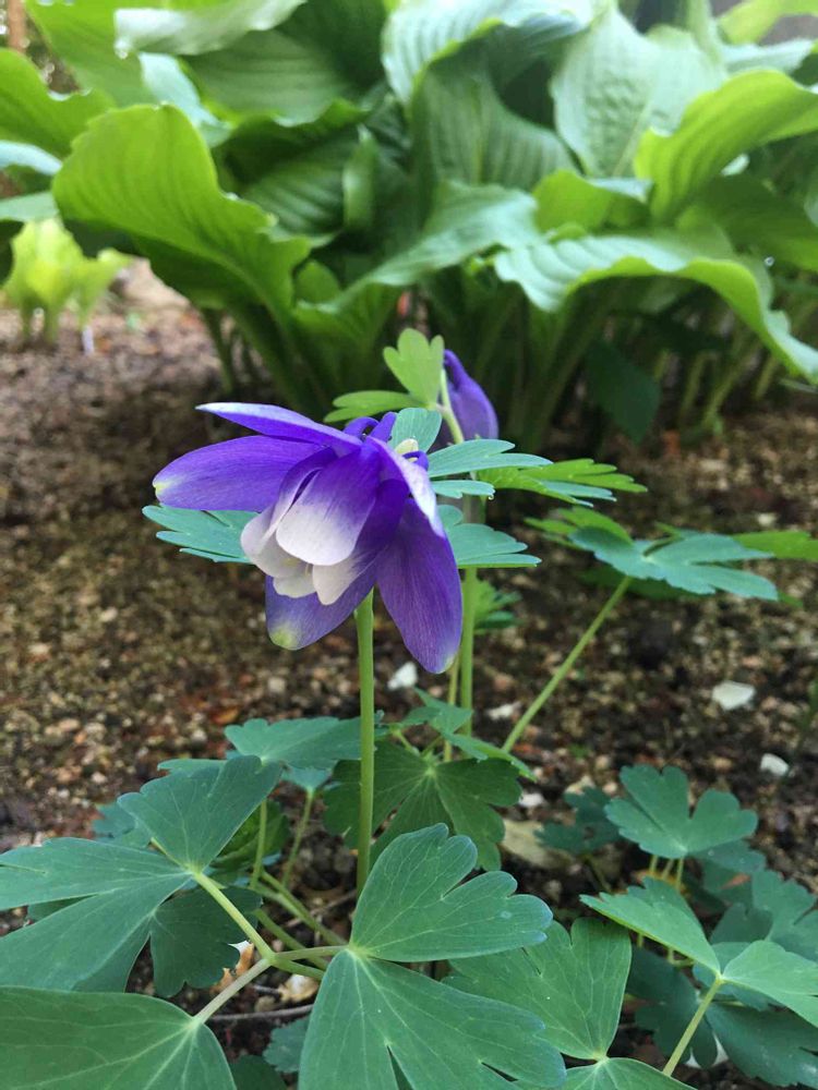 洋種のオダマキもたくさん生えているのですが、このミヤマオダマキの落ち着いた佇まいも捨てがたい。そして、背景には、ホスタ ハニーベルの株立ち。ハニーベルは、このあと葉を大きく展開して、株張り2m近くの大迫力に。夏には芳香系の白花を咲かせます。