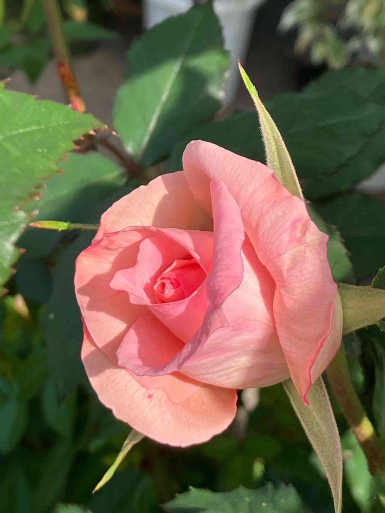 咲きました。今シーズンの第1号です。ベランダのバラたちはたくさん蕾をつけていますが、1番最初に咲いたのはブライダルピンクでした。