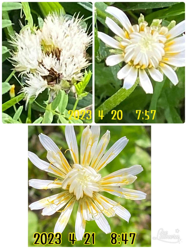 ↗️初めてこの場所で咲いた白花たんぽぽ、まだ開花途中