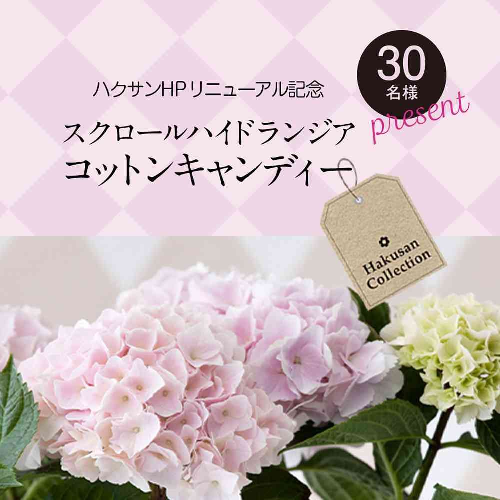 この度Hakusanサイトをリニューアルしました!そのOPENを記念して、スクロールハイドランジア コットンキャンディーを抽選で30名様にプレゼントいたします。