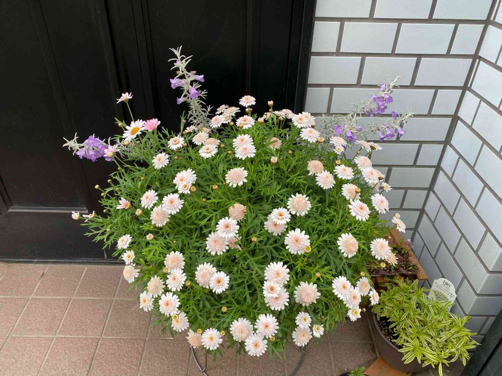 サントリーのボンザマーガレットのイチゴショートなんですけど、昨年の秋に小さい苗を買ったら、大きく育ってくれて、お花がいっぱいに。感動です。多分298円くらいの苗だったと思うんですけど。