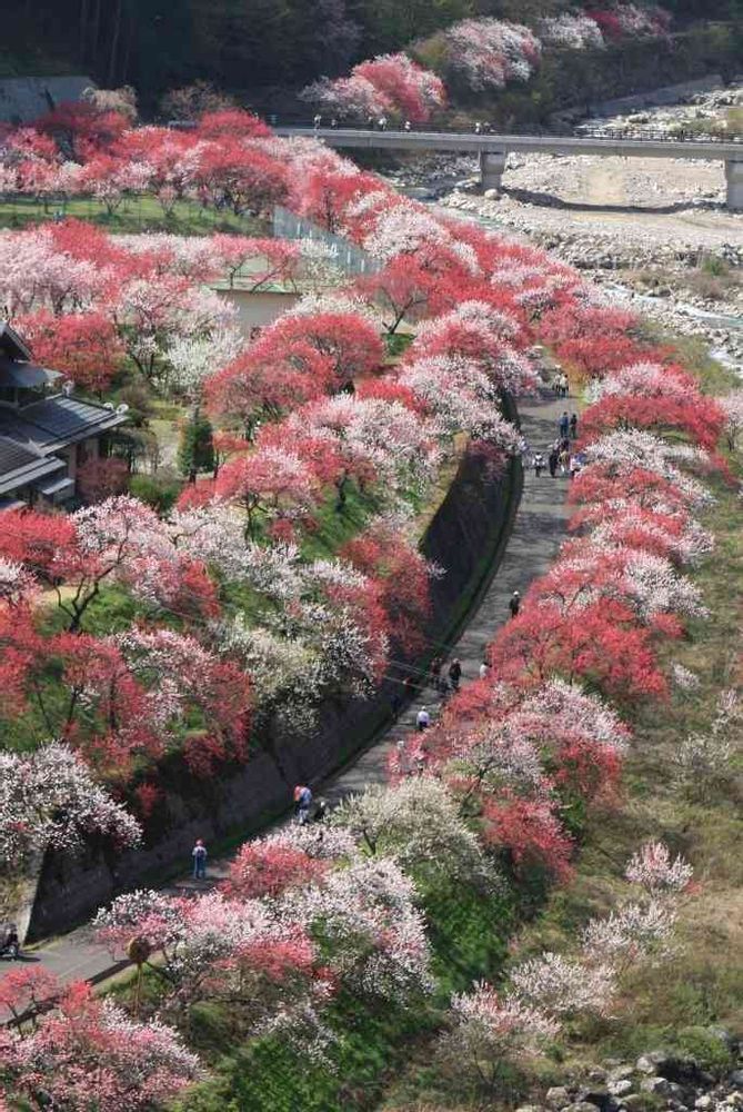 温泉郷が花桃に埋もれるようです。一本に四種類のお花が咲く木もあり綺麗キレイ✨最高よ😃✌️