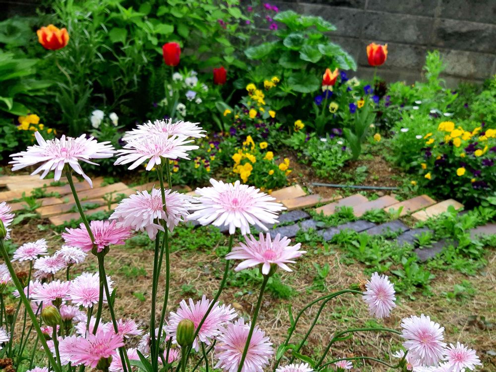 かわいいお花いっぱいのお庭に、桃色たんぽぽがさらに可愛く咲いていますね🌸