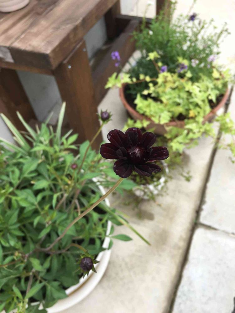 チョコレートコスモスが咲き始めました( ´͈ ᵕ `͈ )まだ途中だけど明日からの雨でどーなるのか(´Д`;)