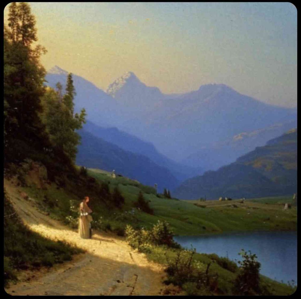 8K,高品質,写実的,油絵, イワン・クラムスコイ, 風景画 , リアル, 青空,湖,山並み,古城,ロマンチック街道,ドイツ