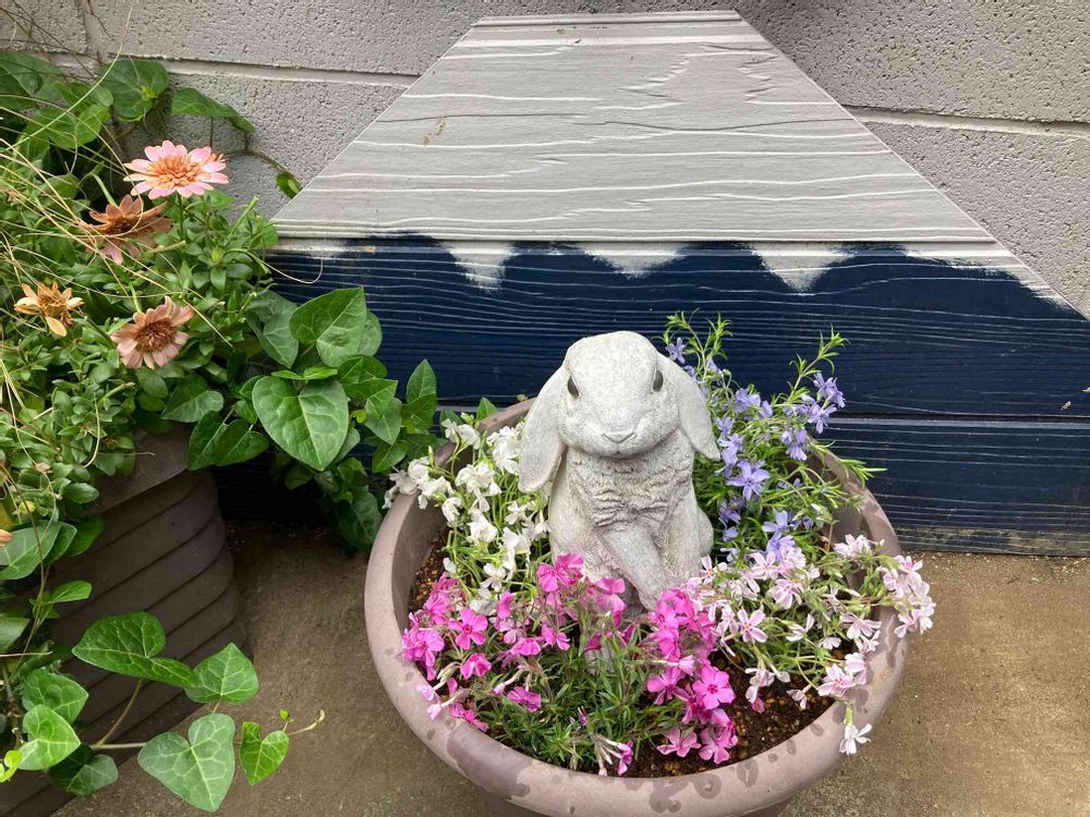 ピーターラビットではありませんがうちにいるうさちゃんと数年前うちを塗り替えた時の塗料の残りで作った富士山をバックに