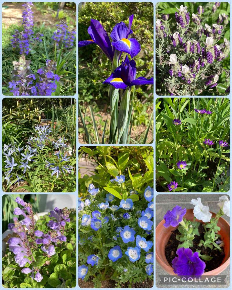 アジュガ、ダッチアイリス、ラベンダーわたぼうし、ミヤコワスレ、ペチュニア、ネモフィラ、