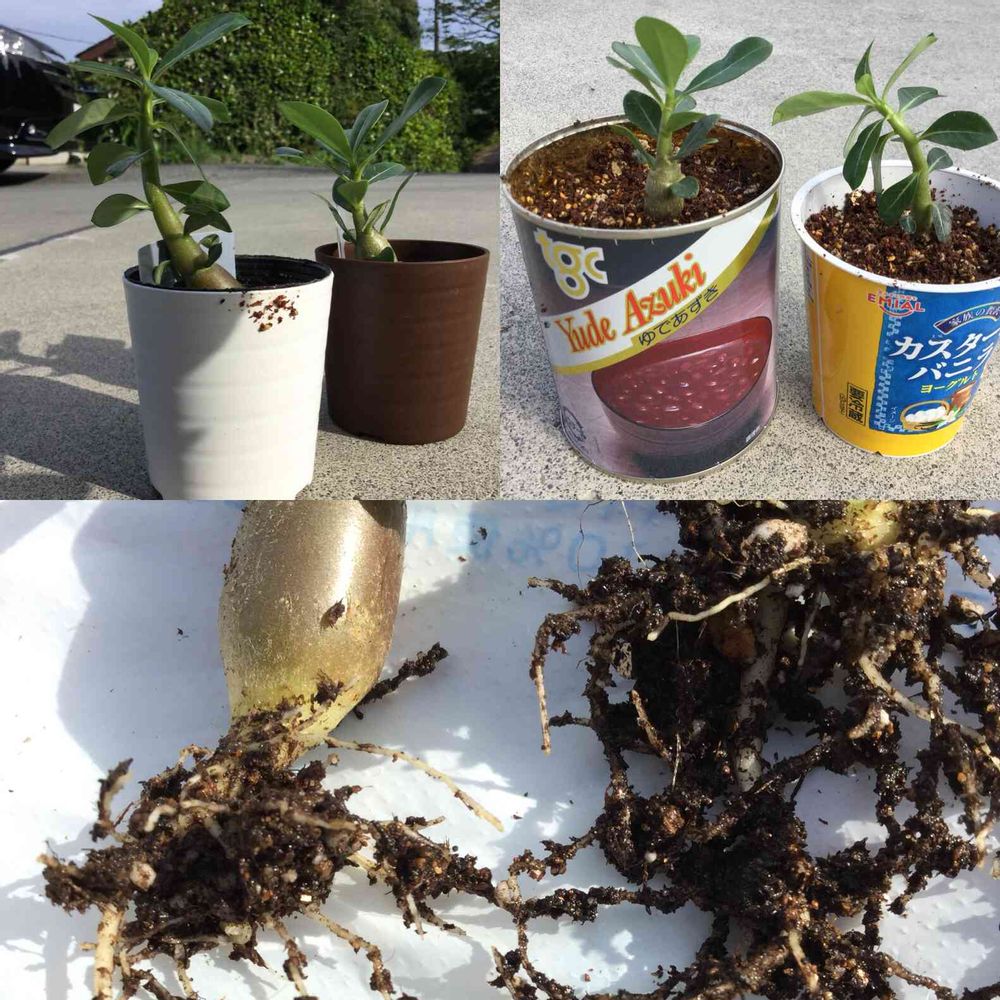 帰りに、ヤシガラブロックを買おうとダイソーに寄ったら、アデニウムが3本売られていたので、来年の予習用パイロットプランツ❓(パイロットフィッシュをもじって😅)として2本購入😊植え替えました🌱