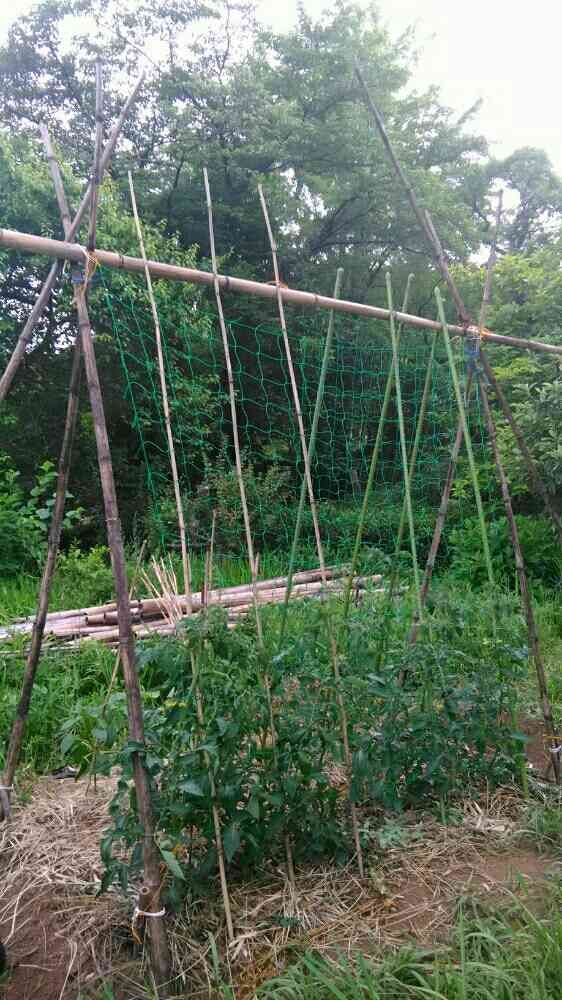 トマトの支柱を立てました。高さ2メートル。脚立に乗らないと上まで届きません。とにかく大きくしたかった・・・