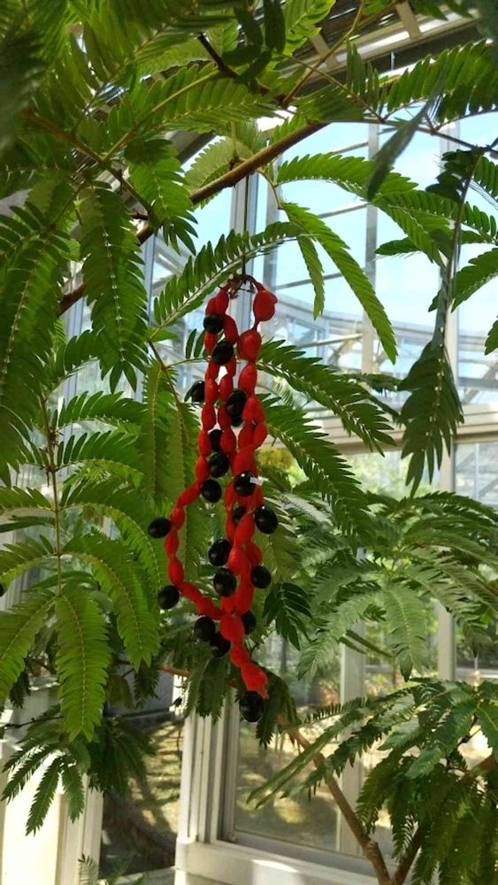 赤いのがボンボンみたいな白い花の後の実で 黒いのが中から飛び出した種のようです。