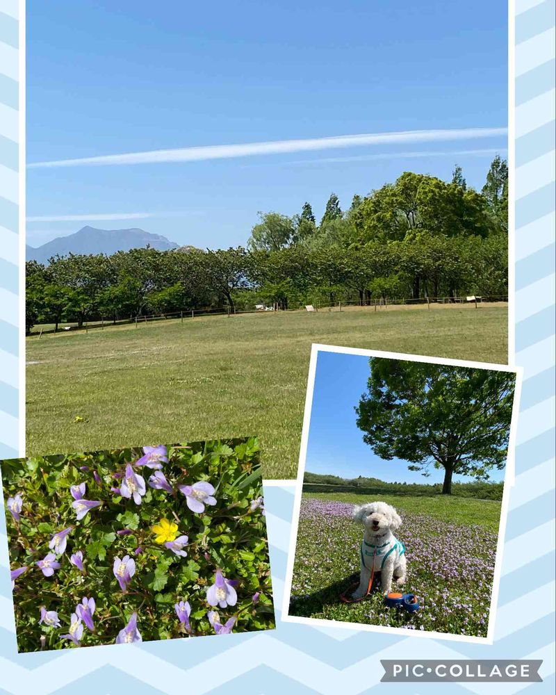 お池の周りをクルリンとお散歩してきました🐶お日様とお空とお花、皆んな仲良しさんだったワン💓