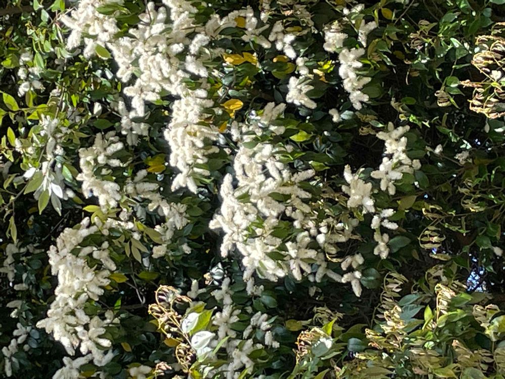 静岡県湖西市の山 地面に小さな白い花(5枚花弁)がたくさん落ちていて、何かと思って見上げたら、どうもこの花のようでした。たくさんの花が集まってふさをつくっているようです。