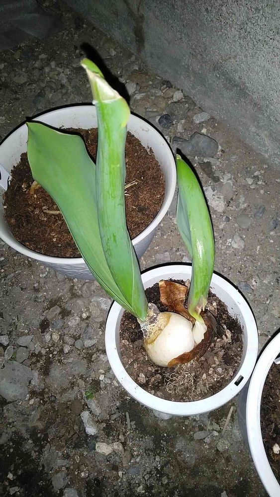 😥昨日の強風&猫のイタズラで鉢が倒れて、球根が傾いたので、一回り大きい鉢に球根が隠れる位に土をかける予定です