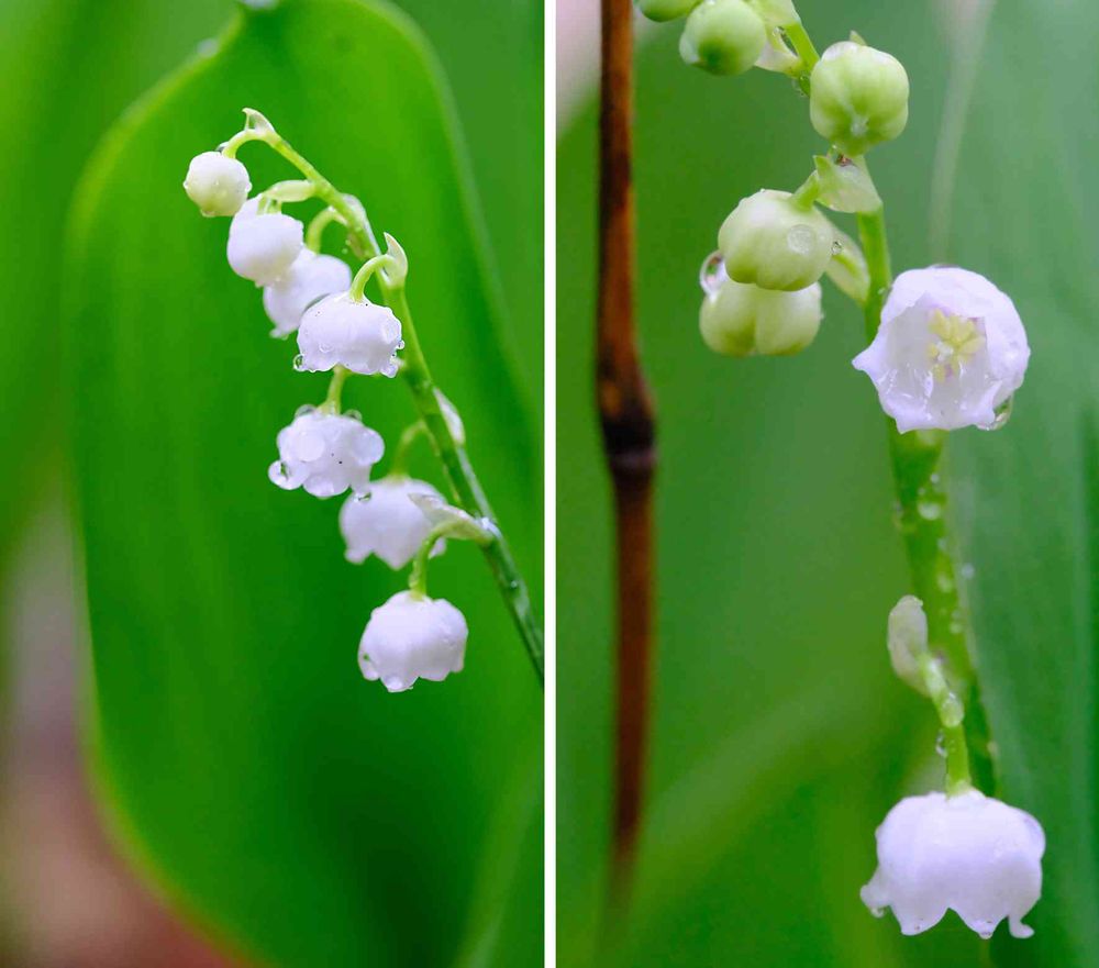 ドイツスズランと日本スズランの違いは葉のつき方(日本スズランは花が上)、花の形(日本スズランの方が長い)などがありますが、花の奥に赤紫のように見える部分があるのはドイツスズランです。