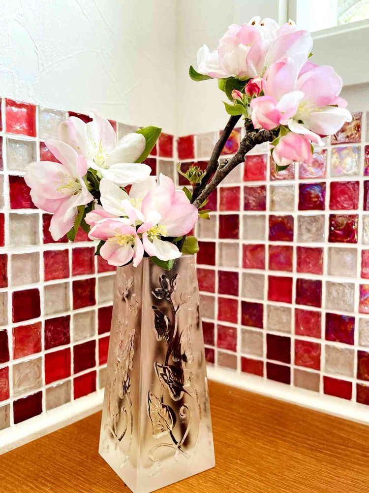 りんごのお花も可愛いけれど背景のタイルも可愛いですね😃これは壁ですか?それともプレートなのかな?