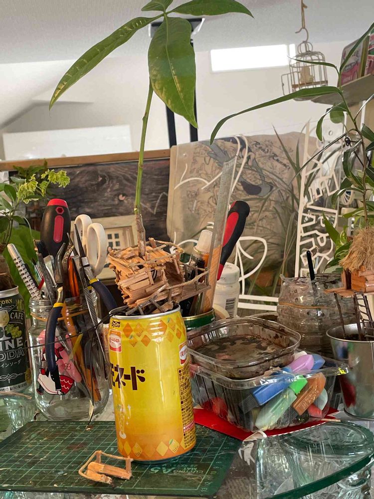 百均やら、 ホームセンターで売ってる 一番小さい観葉植物に、 ちっさい家、作ったりしてます。 ちっさい家用の家具も作ります。 窓にお弁当のふたとかのプラ貼って ガラスっぼく…電気もつきます💡