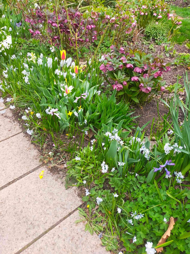 お花はクリスマスローズや原種系チューリップ、水仙やブスキニアやシラーなどの球根草が中心です