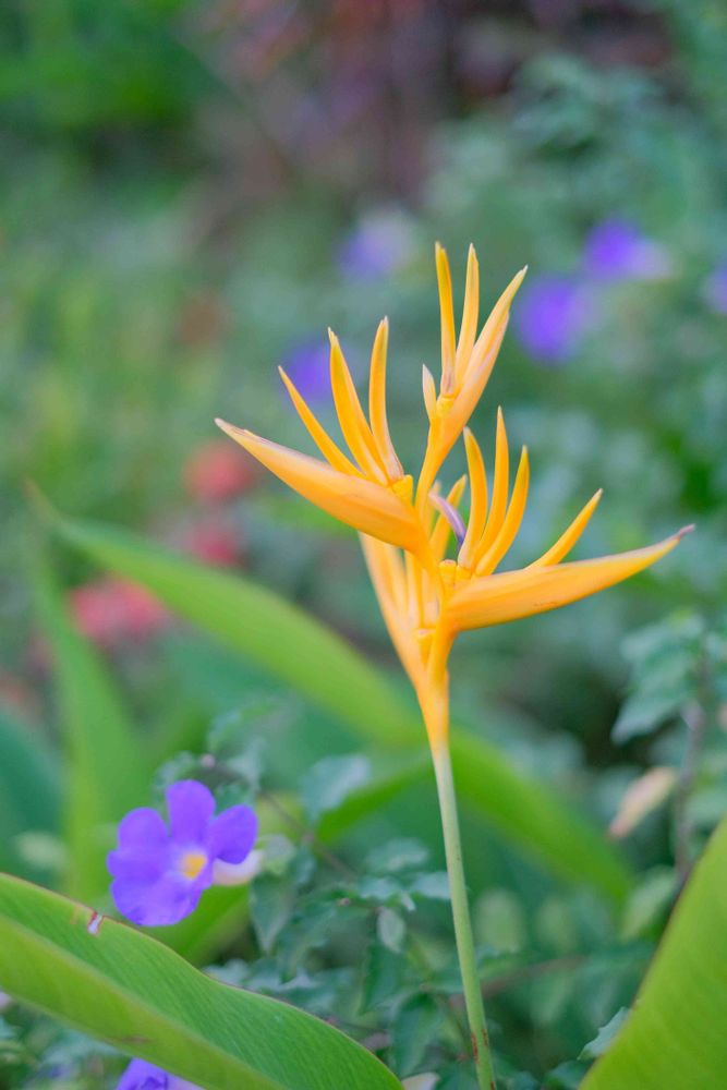 こちらはいつもの散歩道のヘリコニア。ゴールデントーチの方。紫のツンベルギアとお似合いです。