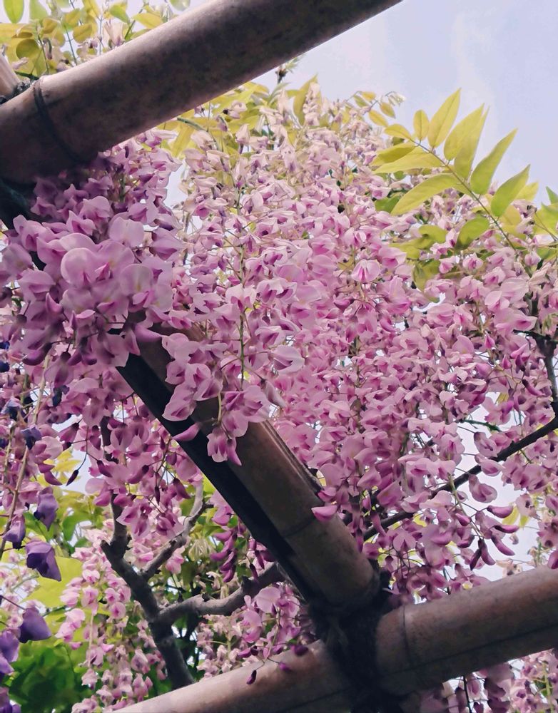 藤棚の下に座って、上を見たらこのピンクのフジと目があって😊
