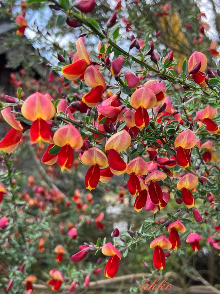 こぼれ種で、あちこち赤や黄色のエニシダが咲いていて、
