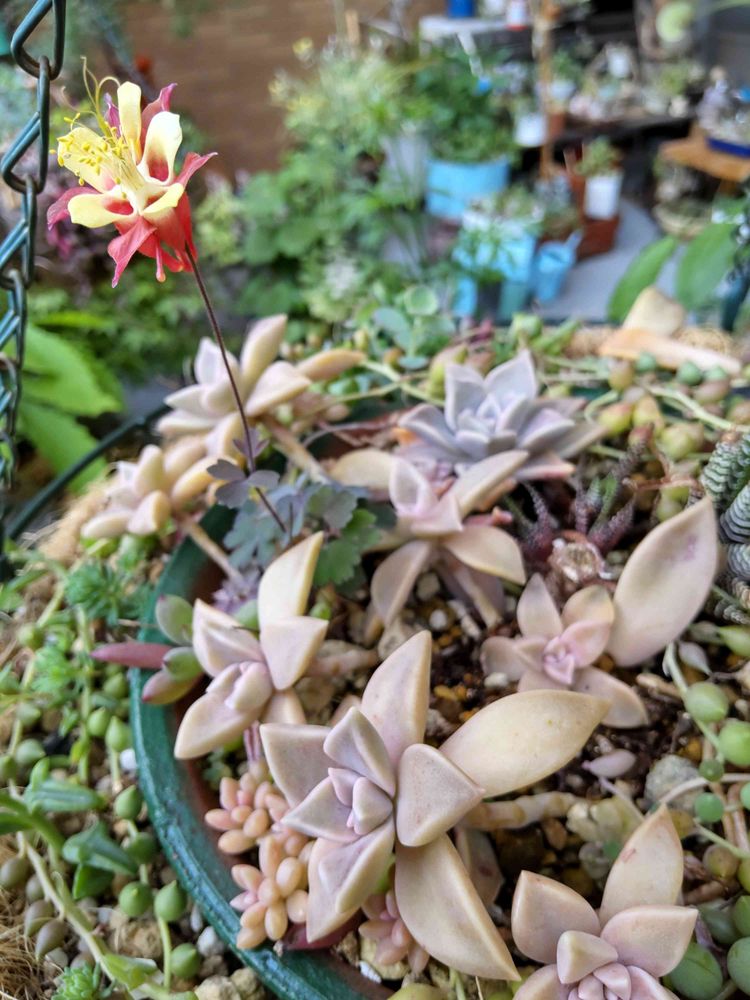 多肉ハンキングからオダマキが1輪咲いてます🌼
