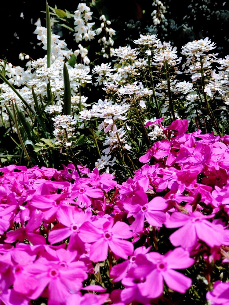 シバザクラとイベリス 奥にヒメウツギが元気に咲いています🌸