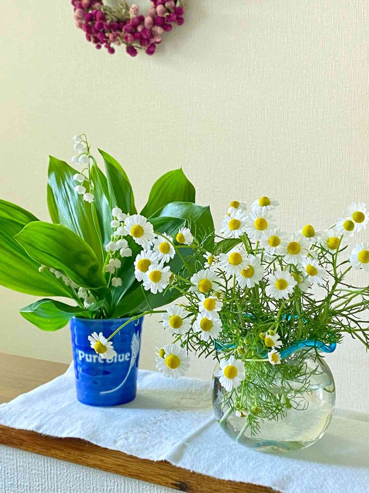 庭のカモミールとスズランが咲いたので、少しずつ並べて、廊下に飾りました。そばを通るたび 「私たち いい香りがするでしょ〜💕」と、花達の声が聞こえきます ついつい立ち止まって深呼吸・・(´∀`)🌿🌿