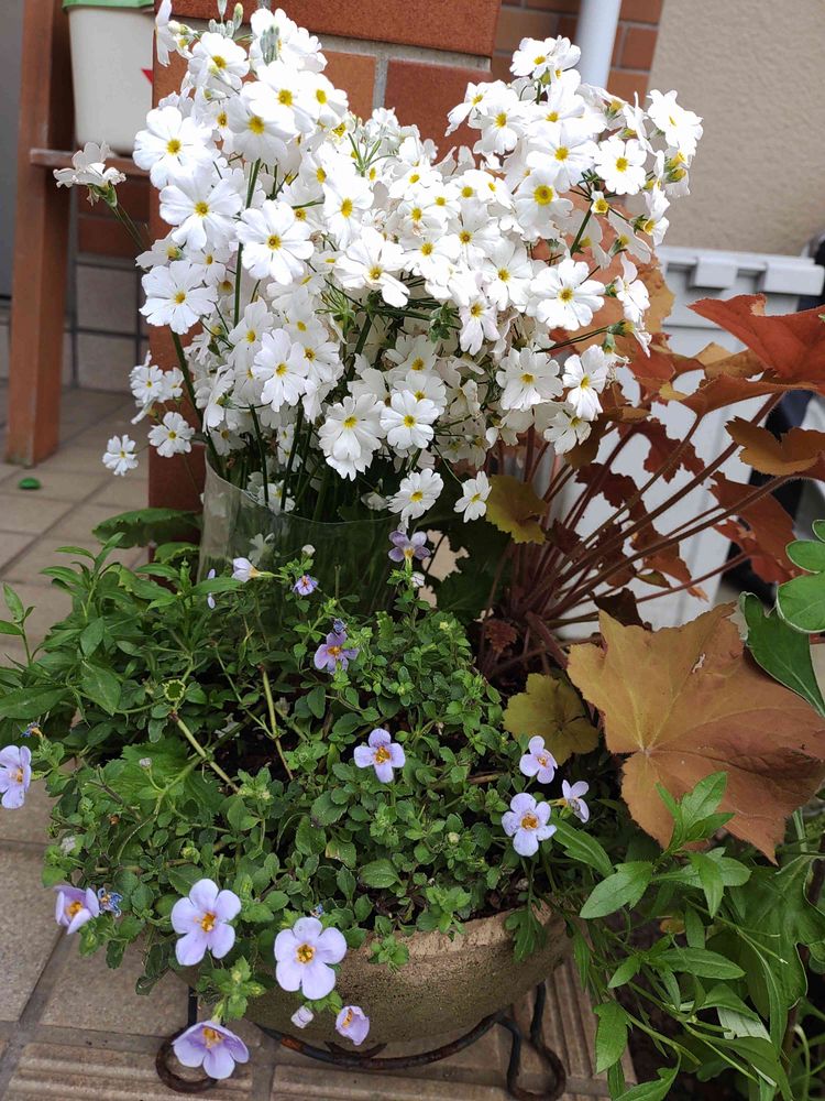 サクラソウが倒れて、他の植物がみえなかったので、ペットボトルを筒状に切って、花の下にギプスのようにくっ付けた!