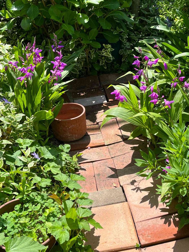 花があっちこっちから出て来て歩く所が無くなるので、その辺に転がってたレンガを寄せ集めて やっと敷きました。