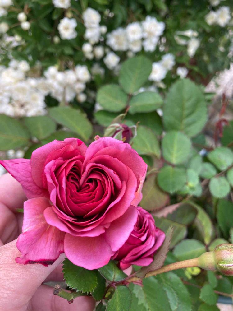 今年は冬剪定していないので、ちょっと伸びて枝垂れてきたので、手で持ち上げてます☺️お花が終わったら短めにカットしてみようかな✨