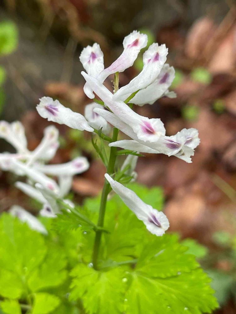 ムラサキケマンの白花で、花びらの先端に紫色が残っています。