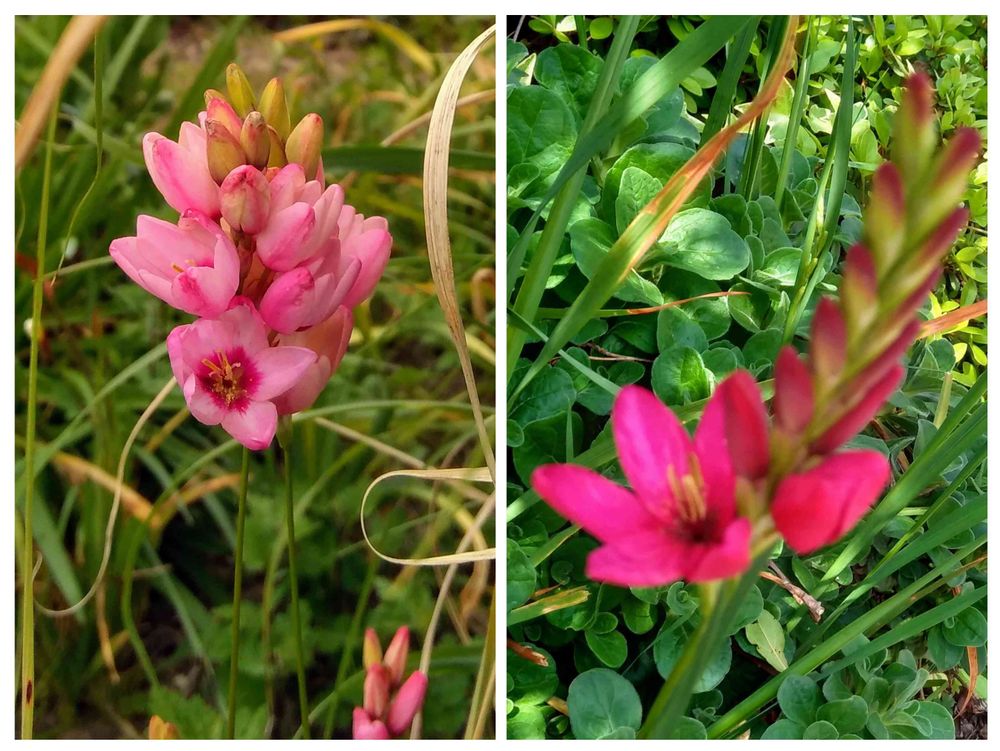 実家で咲いてる濃いピンク(右)とご近所で咲いてるピンク色(左)