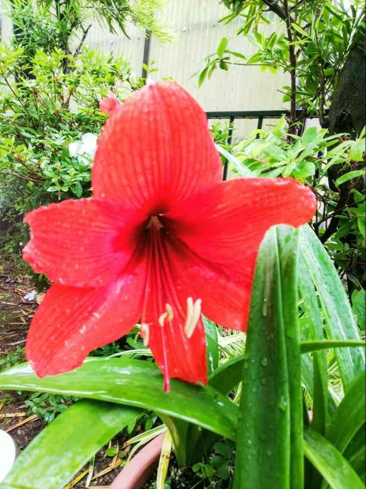 こんにちは👋😃外壁工事で端の方に追いやられていたアマリリス‼️主人が(花の名前をほとんど知らないのに😅)アマリリス咲いてるぞ🌼と教えてくれました❗️バタバタしてて気が付かなかった私😣