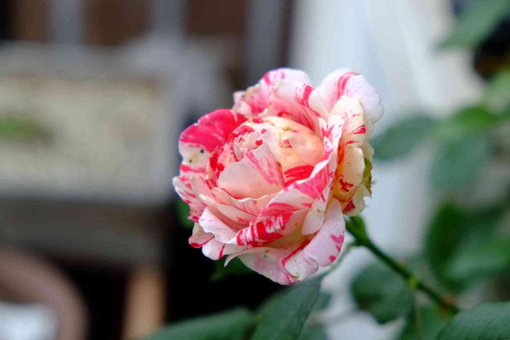 今シーズン第一号は白多め。花びらに穴が空いてるのは虫のせい?
