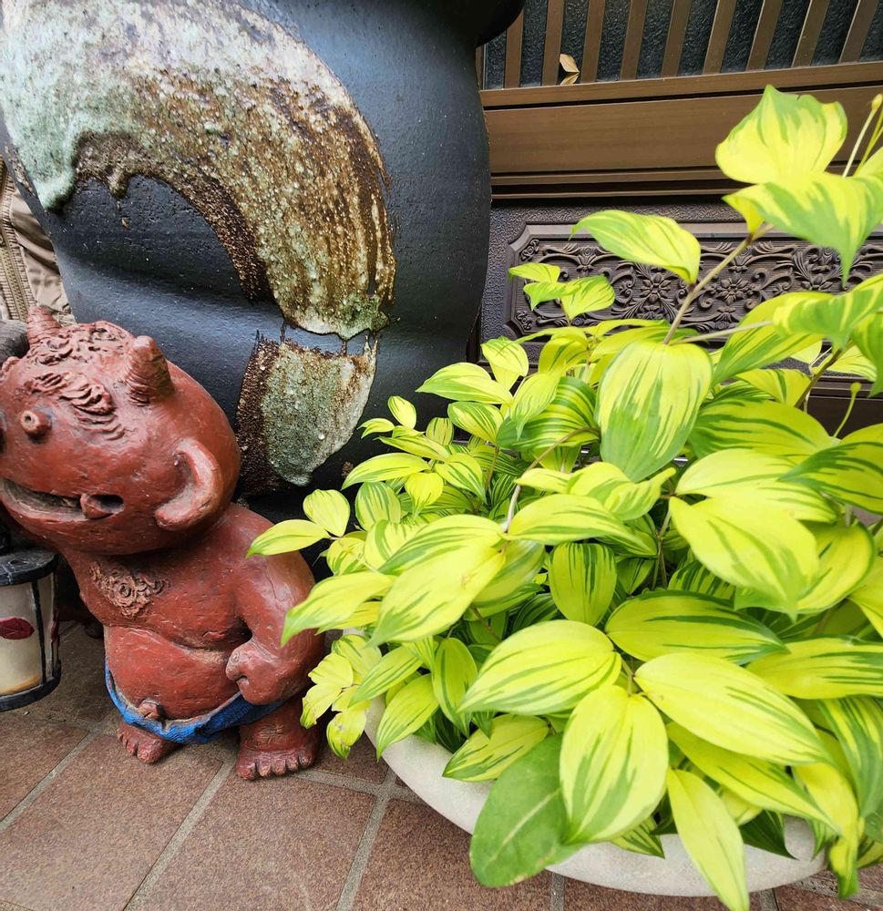玄関前に大鉢の斑入り稚児百合を飾りました😃