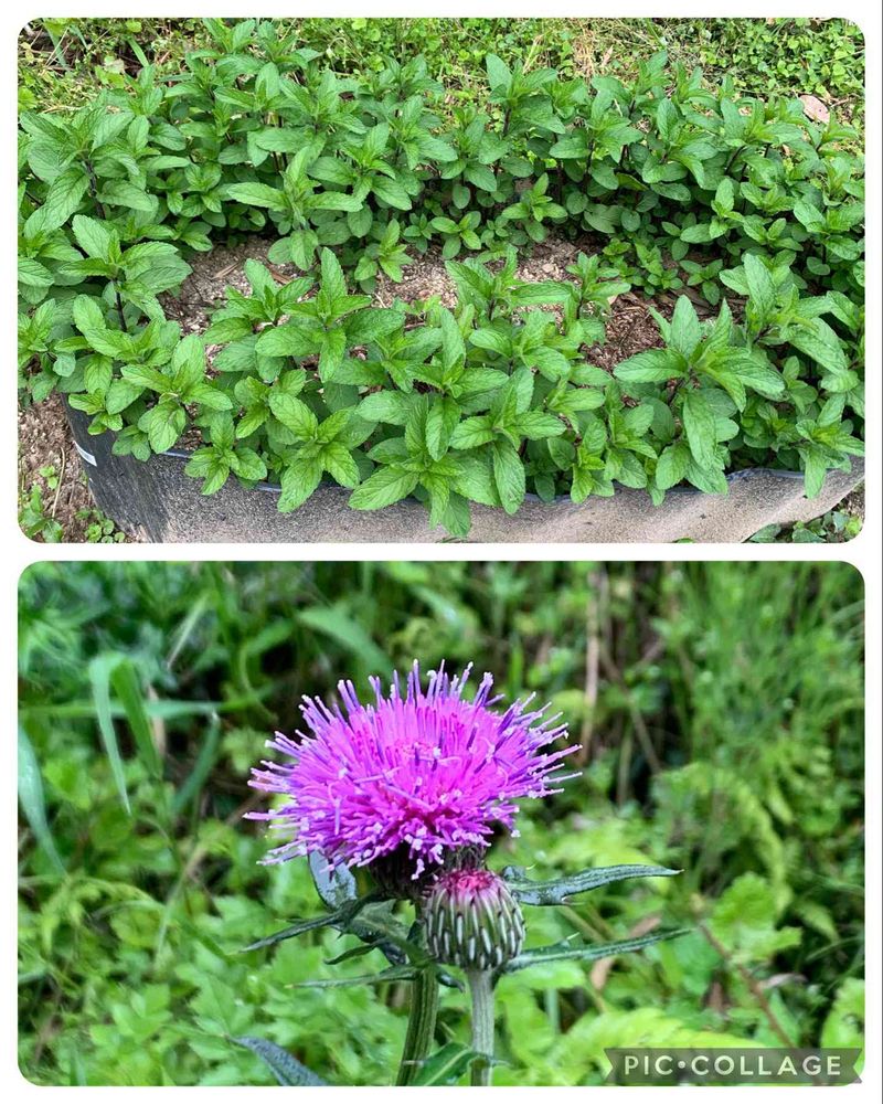 今朝の庭のパトロール😀日本薄荷がランナーで増えてギュウギュウですけど😅💦畦板で囲って正解でした😀アザミも勝手に咲いてます😅