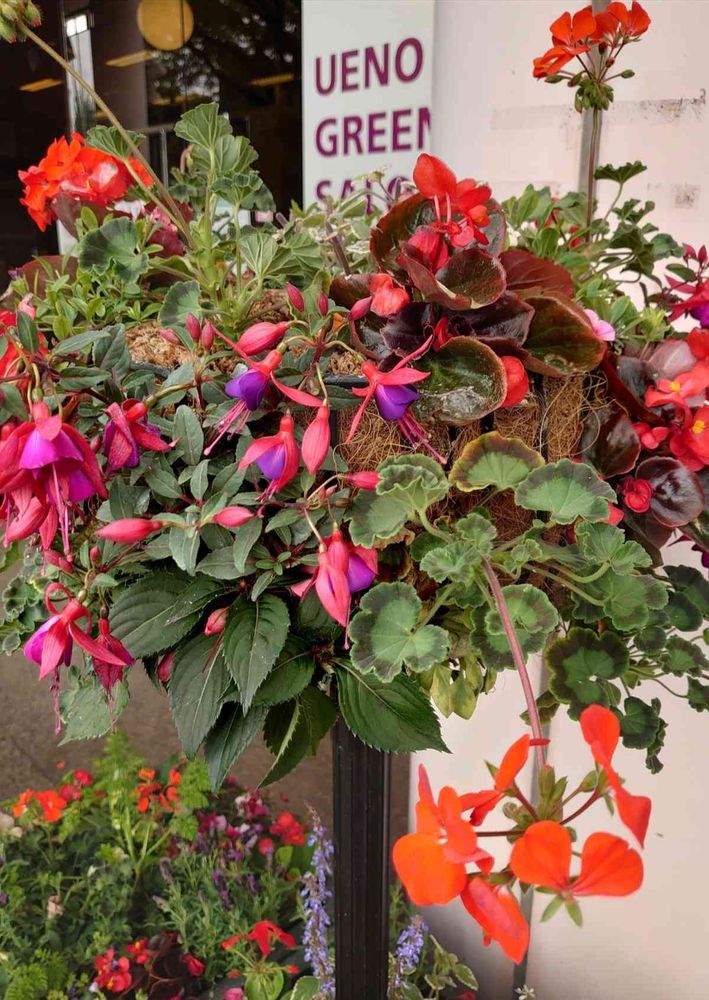 赤いゼラニウムやフクシアが可愛らしいです。フクシアは赤い部分は萼なので花は紫色です💜